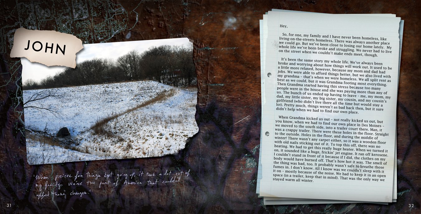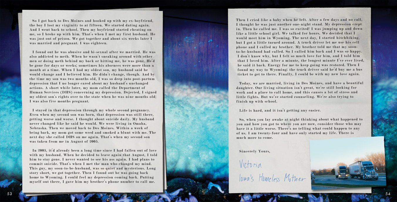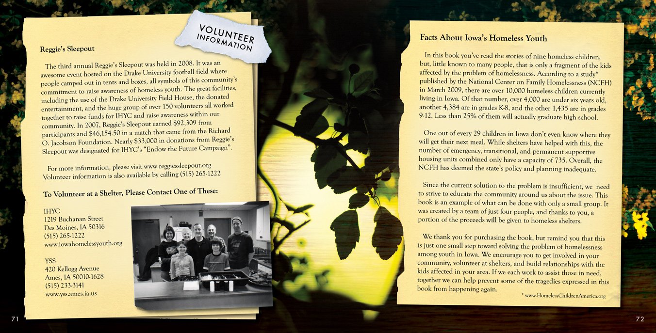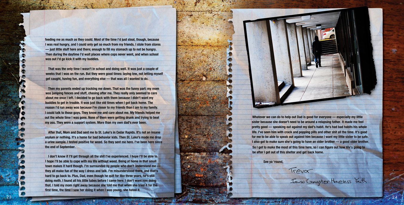 Our first book is a 74-page collection of stories from nine homeless teenagers from Iowa, complimented by multi-layered visuals on every page. My friend, Danny Heggen, interviewed the children and pieced together their heartbreaking stories. Then my brother Wes and I went out and took photos of the landmarks they mentioned in their stories and brought them to life through layout and design in collaboration with Nicole Anderson. We printed it locally and marketed it throughout the midwest at local coffee shops and book stores, raising over $40,000 for homeless youth shelters as a result.
