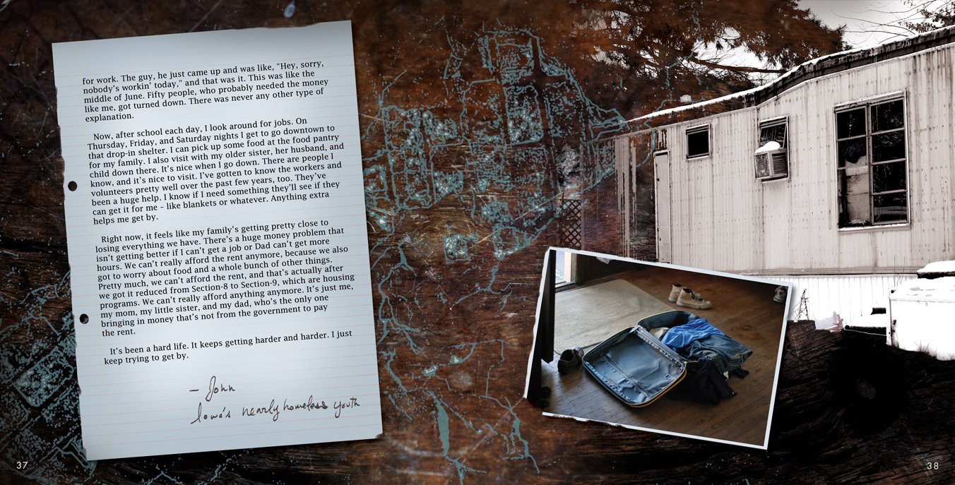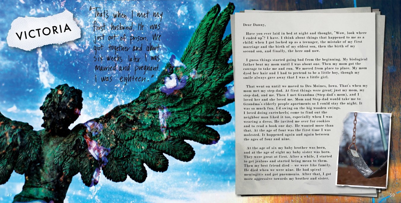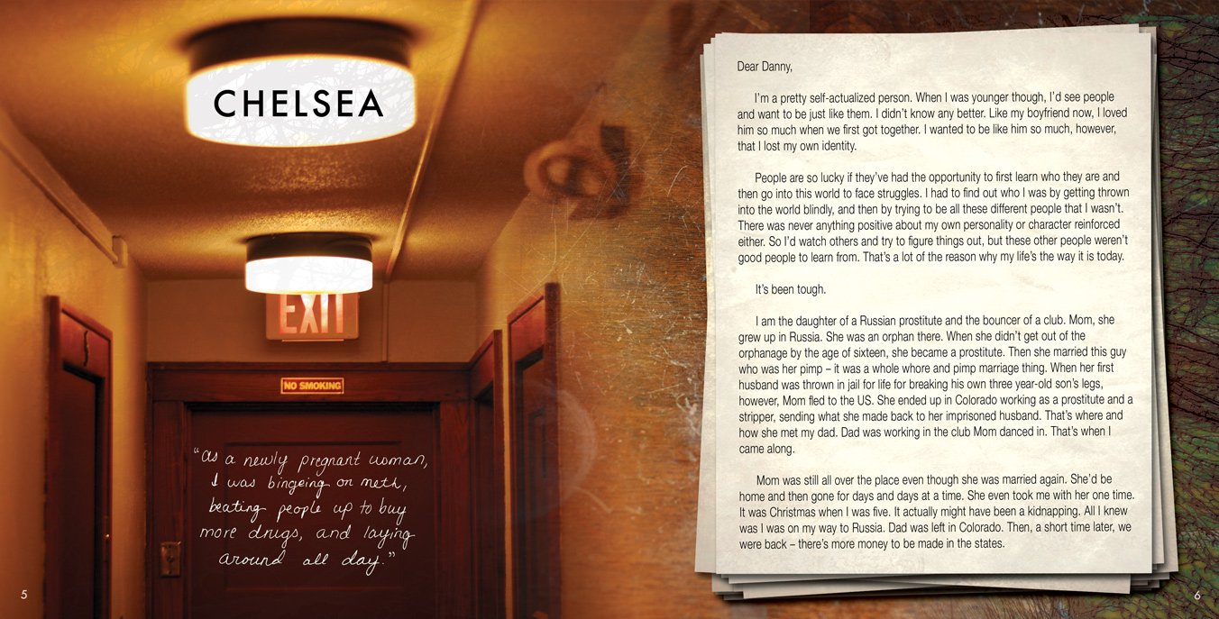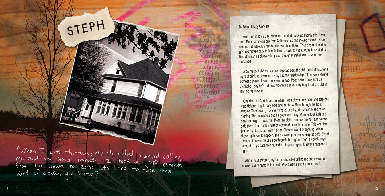 Our first book is a 74-page collection of stories from nine homeless teenagers from Iowa, complimented by multi-layered visuals on every page. My friend, Danny Heggen, interviewed the children and pieced together their heartbreaking stories. Then my brother Wes and I went out and took photos of the landmarks they mentioned in their stories and brought them to life through layout and design in collaboration with Nicole Anderson. We printed it locally and marketed it throughout the midwest at local coffee shops and book stores, raising over $40,000 for homeless youth shelters as a result.